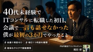 40代で未経験に近い形からITコンサルへ転職した僕が、初日の挫折と、そこから立ち上がるために最初の3か月で実践したことをまとめました。不安の乗り越え方と、地味でも効く行動を具体的に紹介します。